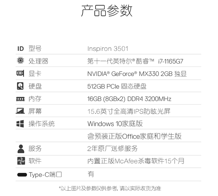 戴尔笔记本电脑dell灵越3501 15.6英寸高性能商务全面屏办公轻薄本(11代i7-1165G7 16G 512G MX330 2G)